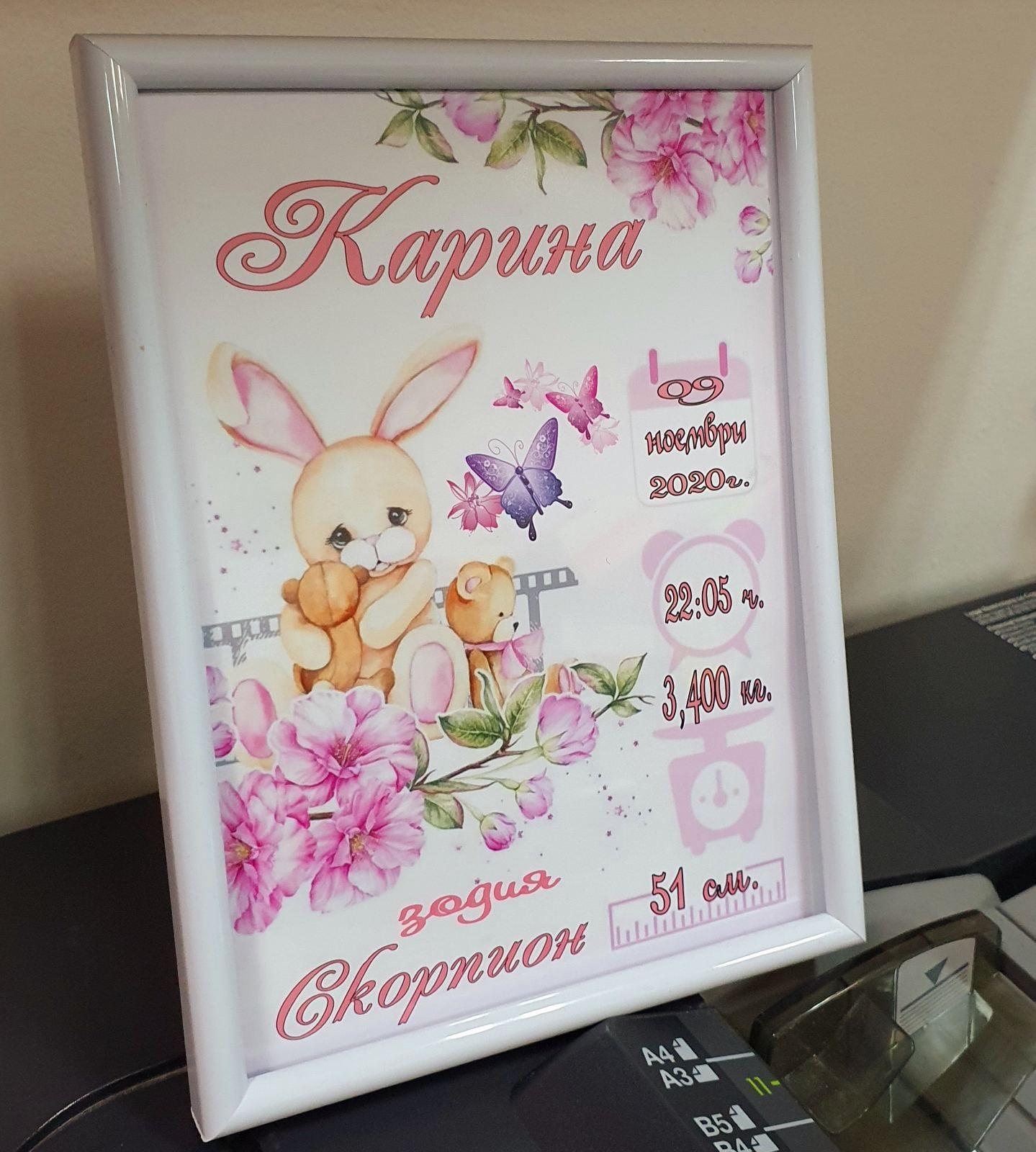 Бебешката визитка се изработва индивидуално, съдържа най-важната информация за раждането на Вашето бебе.