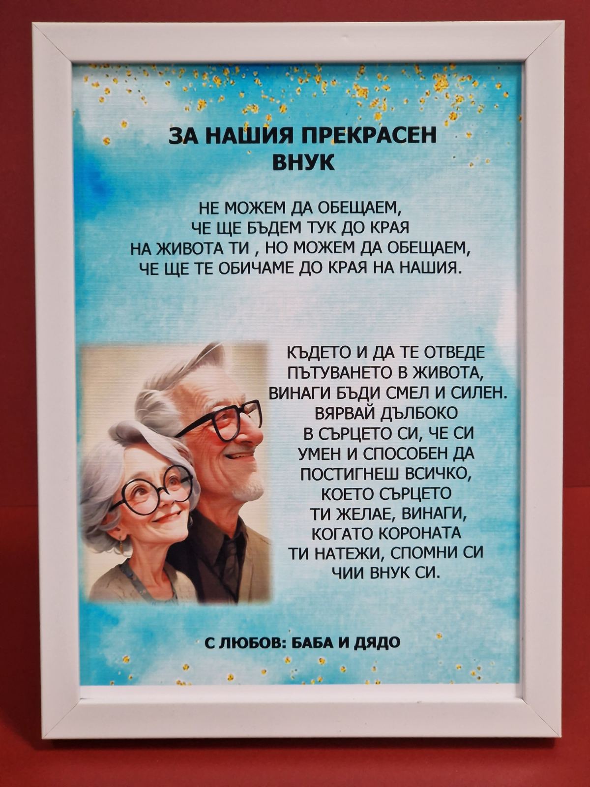 Стилно оформено послание за внук, от баба и дядо, поставено в дървена рамка.