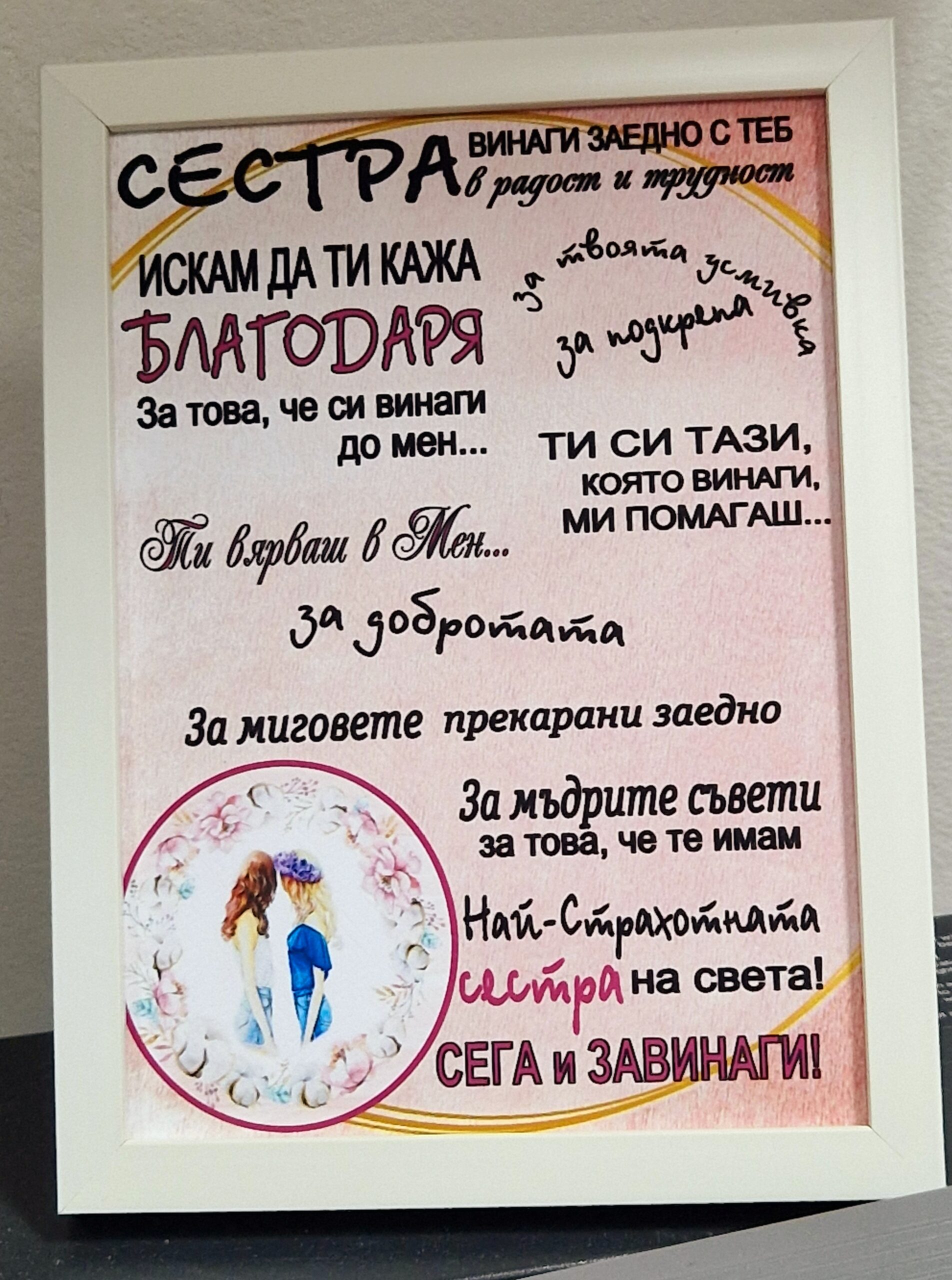 Стилно оформено послание за вашите любими хора, поставено в дървена рамка.